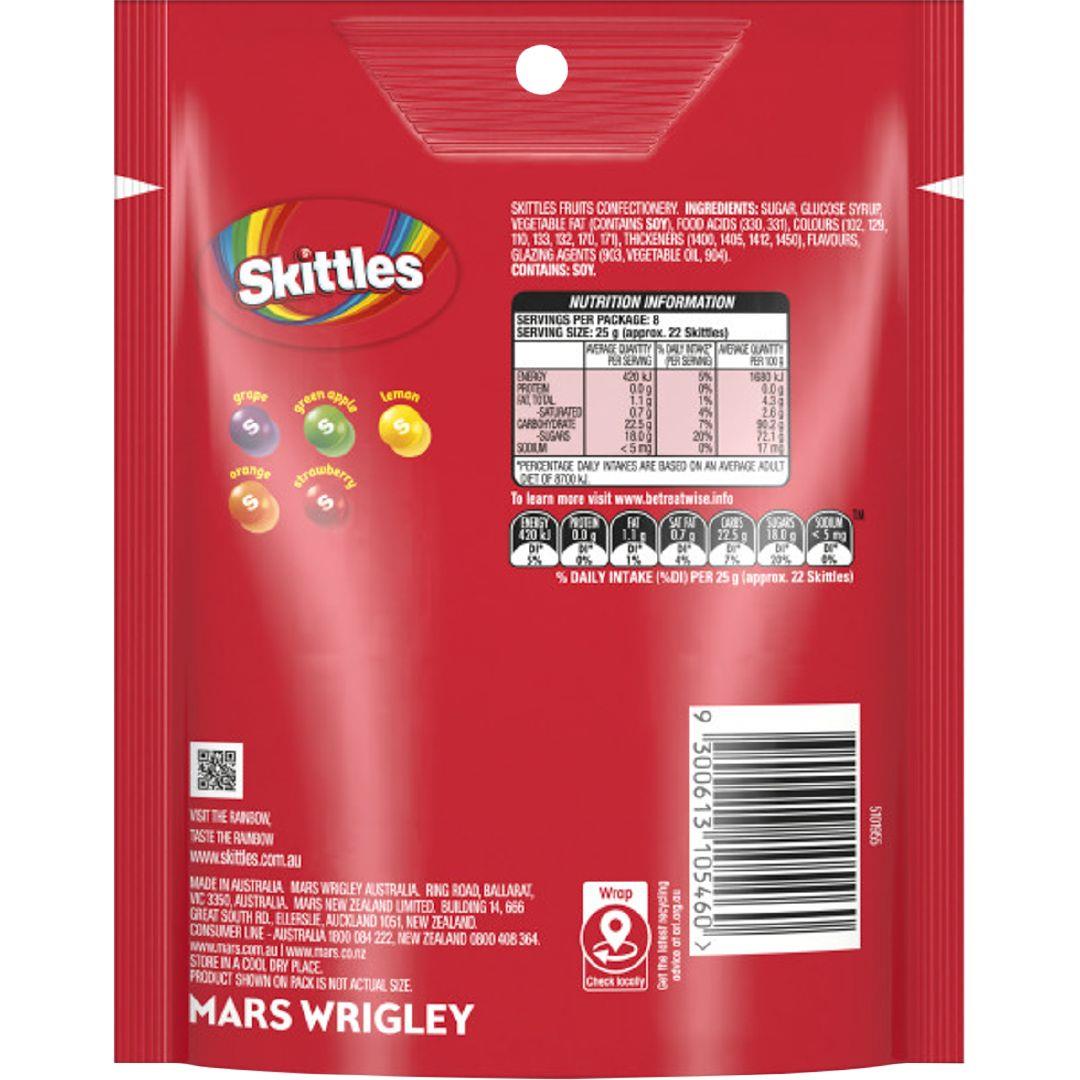 "SKITTLES is a bite-sized chewy lolly with a colourful crispy shell. SKITTLES Fruits comes in a mix of fruity flavours, including: lemon, orange, strawberry, green apple and grape. Share the rainbow, Taste the Rainbow! "