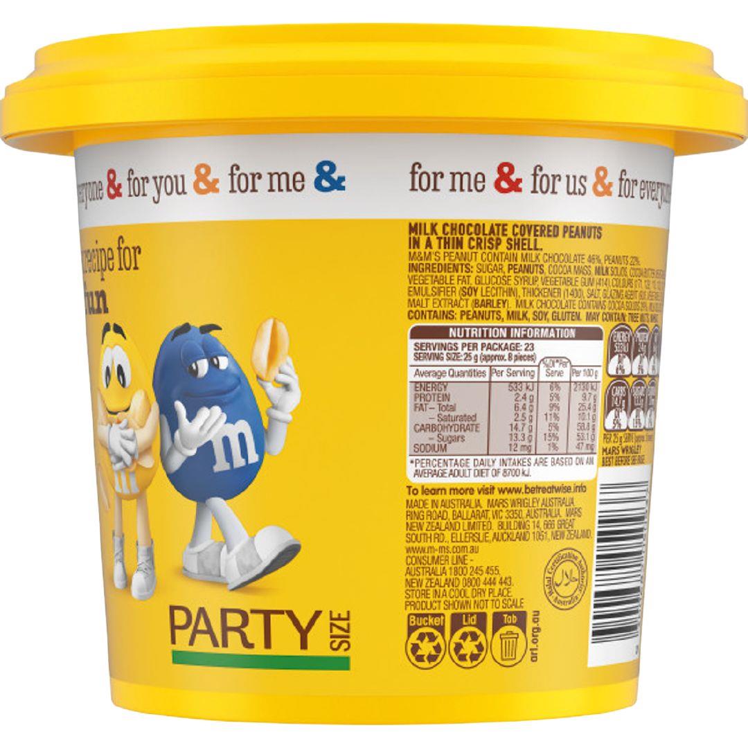 "Take Home the Fun with M&M'S Peanut.  This chocolate favourite features milk chocolate with a roasted peanut, coated in a colourful crisp shell. They are perfect to be enjoyed with your favourite movie, brought to share at a party or added to brighten a lolly buffet at your next gathering.  Add some fun and colour to your day with M&M'S Peanut!"