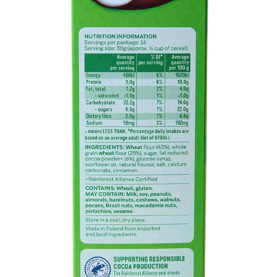 - Wheat flour 43%, whole grain wheat flour 25%, sugar, fat reduced cocoa powder 6% (Rainforest Alliance Certified); glucose syrup, sunflower oil, natural flavour, salt, calcium carbonate, cinnamon