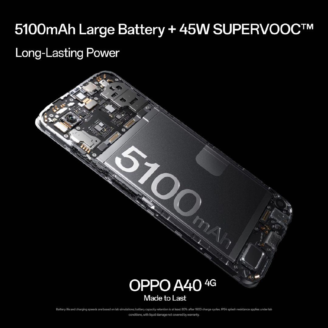 The OPPO A40, designed for durability and performance. With military-grade shock resistance, a 50MP Ultra Clear Camera, and a bright 6.6-inch 90Hz display, it delivers stunning visuals and resilient protection. Enjoy ample 128GB storage, expandable to 1TB, and stay powered with a 5100mAh battery and 45W SUPERVOOC fast charging. The OPPO A40—built to last, made for your lifestyle.