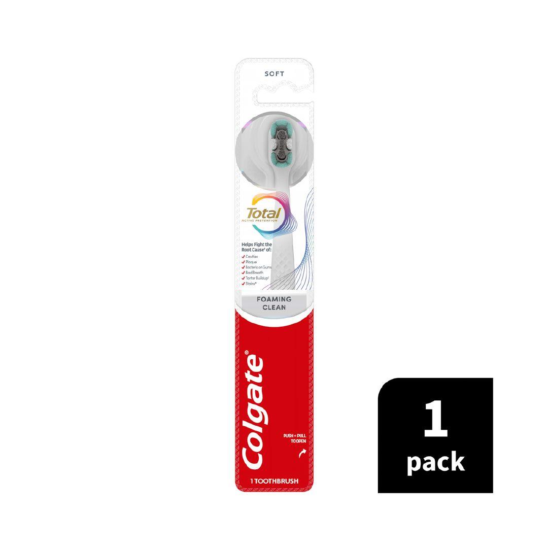 - The Colgate Total Active Prevention Foaming Clean toothbrush offers rapid foaming action for deeper toothpaste delivery (2). This specially engineered adult toothbrush features over 5000 high density multi-height soft bristles that give a deep, gentle clean along the gumline and between teeth. Elevate your daily brushing routine and oral care with the Colgate Total Active Prevention Foaming Clean Soft Adult Toothbrush.