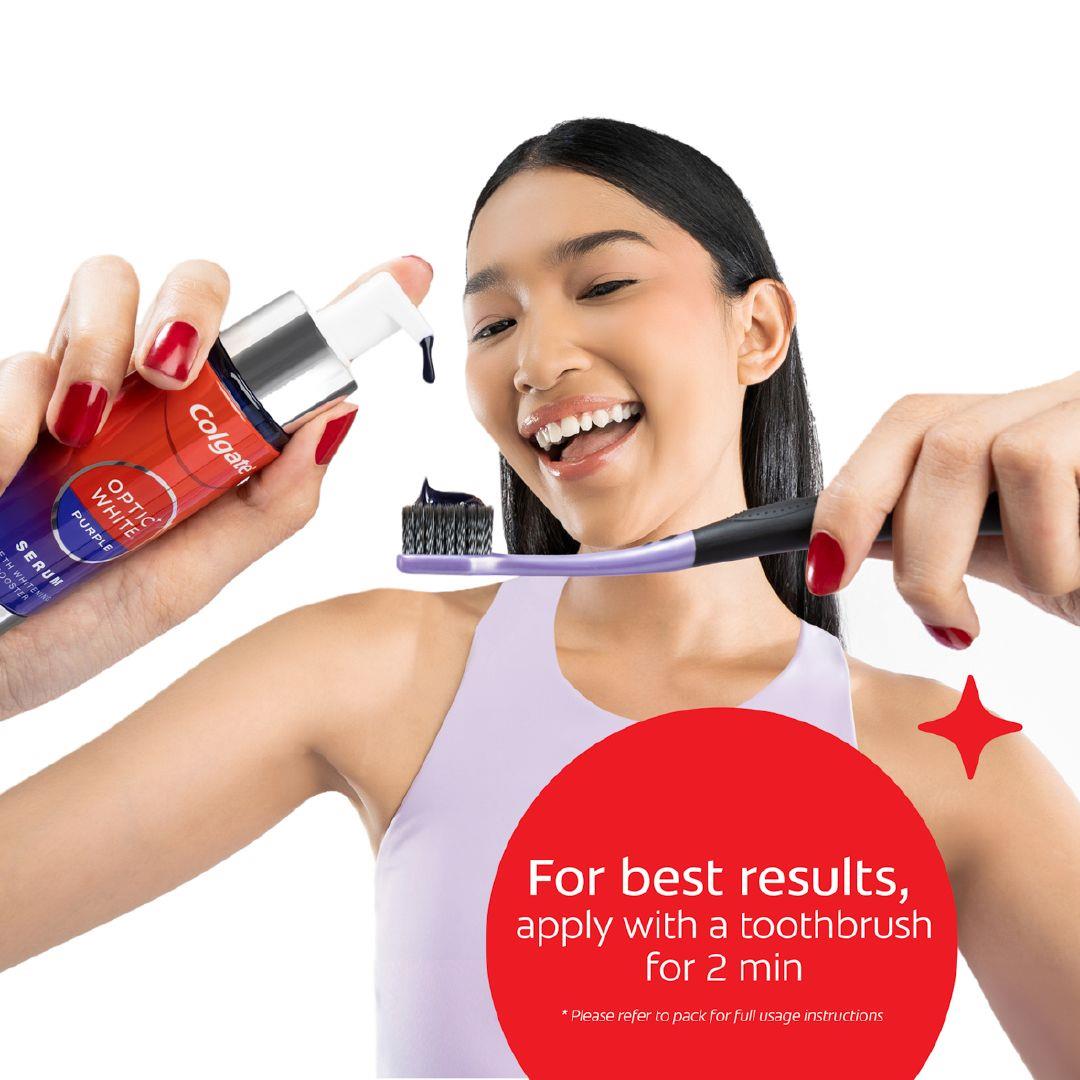 Colgate Optic White Purple Serum. Our ultimate purple serum colour corrects* & acts as a whitening booster**. Features Dual-Action Formula for Immediate Colour Correction* & lasting^ whitening results. A 3-step whitening Boost**. Pump, Purple, Smile! Clinically tested technology, enamel-safe, for daily use. For best results, use the Optic White 5% Hydrogen Peroxide toothpaste and brush for 2 minutes. Following this, apply 1 pump on a soft bristle toothbrush and gently brush for 2 minutes. Expel excess and rinse mouth after use. Do not swallow. *Effect is temporary. **vs brushing with Colgate non-whitening toothpaste alone. ^By removing surface stains with twice daily brushing after 2 weeks of use. Individual results may vary.