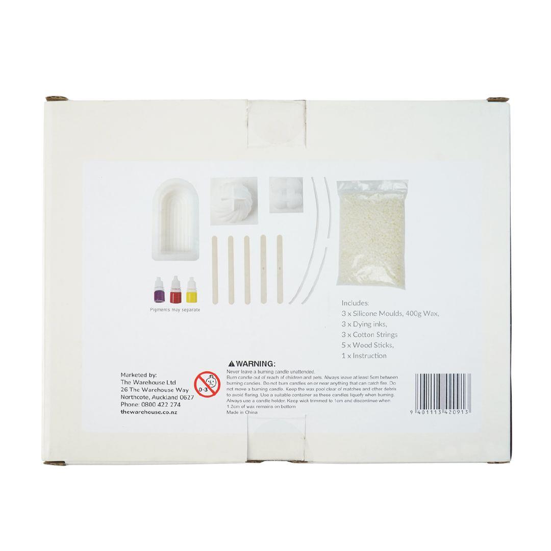 - Includes: 3 x silicone moulds, 400g wax, 3 x dying inks, 3 x cotton string, 5 x wood sticks, 1 x instruction sheet