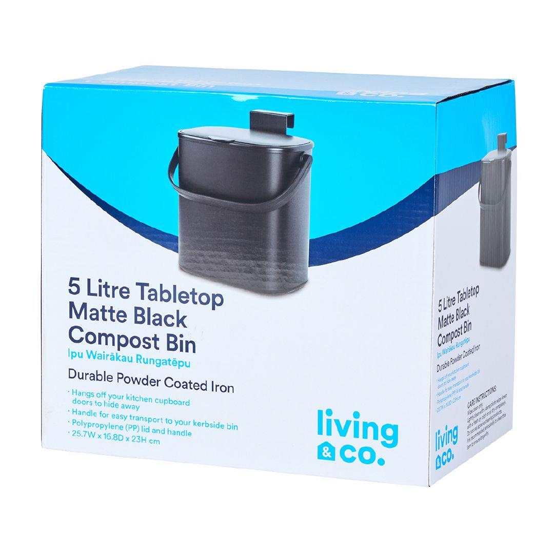 The Living & Co Tabletop Compost Bin in black offers a practical solution for managing kitchen waste with ease. Its compact design fits neatly on your countertop, while the sleek black finish complements a variety of kitchen styles. Ideal for collecting food scraps, it helps support eco-friendly habits at home.