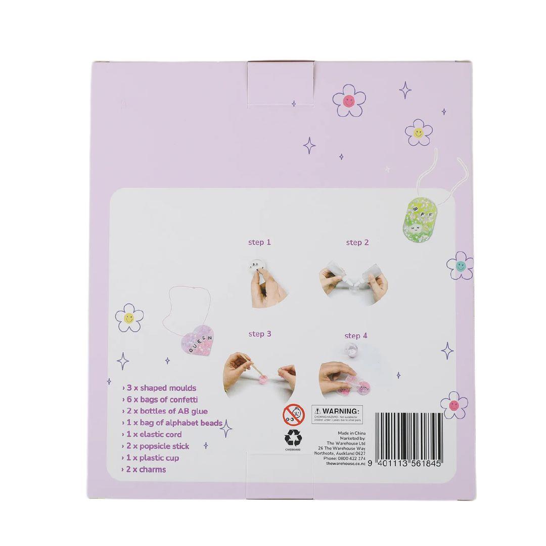- Includes: 3 x shaped moulds, 6 x bags of confetti, 2 x bottles of AB glue, 1 x bag of alphabet beads, 1 x elastic cord, 2 x popsicle sticks, 1 x plastic cup, 2 x charms