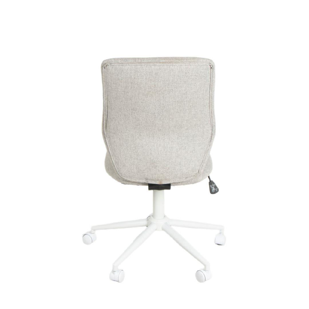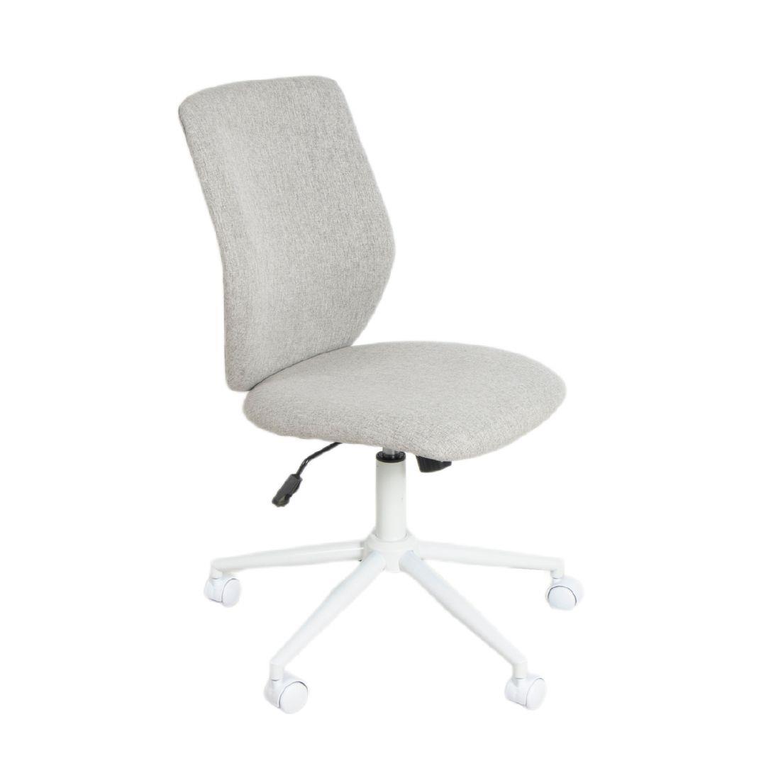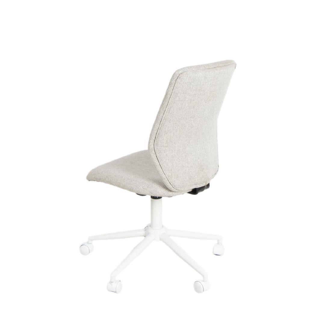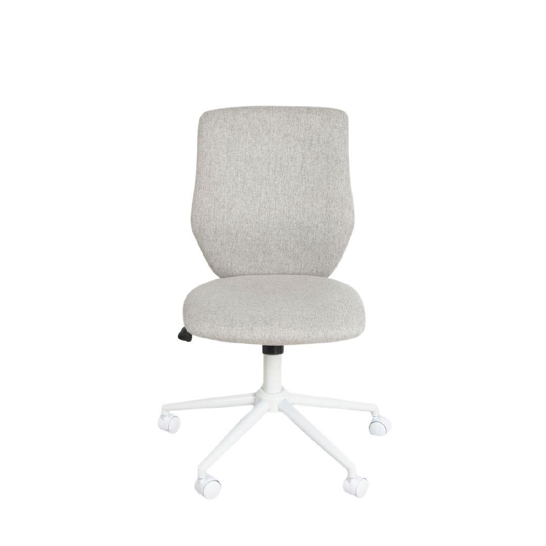 This light-grey office chair features an ergonomically curved backrest that provides enhanced lumbar and back support, promoting healthy posture throughout the day. The cushioned seat and soft fabric add comfort, while the white five-star base and smooth casters ensure stability and easy mobility. With adjustable height and a clean, minimalist design, it delivers the perfect balance of ergonomic support and modern style for any workspace.