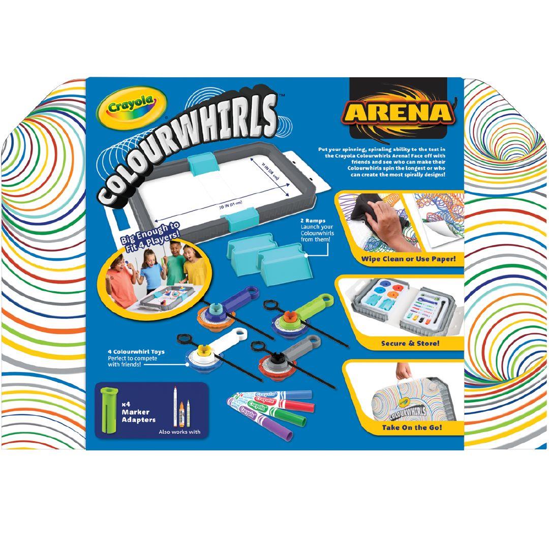 Step into the ultimate creative showdown with the Crayola Colourwhirls Arena! Transform your Crayola Marker into a spinning top and create vibrant, spiraling designs that are as unique as each spin. Designed for friendly competition, the arena lets up to 4 players launch their Colourwhirls using ramps, adding a thrilling challenge to the fun. Watch the exciting battles unfold as tops spin, clash, and create dazzling patterns, combining art, strategy, and play in one action-packed experience. Perfect for group fun, this innovative set brings together creativity, competition, and colorful entertainment for kids and adults alike.