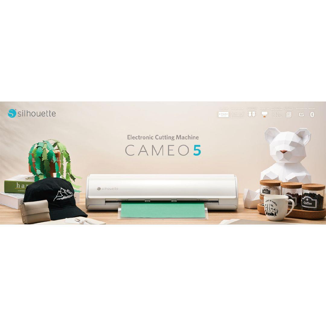 - What is included: Silhouette Cameo 5 in Classic White, AC Adapter/Power Cable Set, Cutting Mat, AutoBlade, Blade Adjustment Tool, Roll Feeder, Silhouette Studio Software (download), and 50 exclusive designs (available with registration)