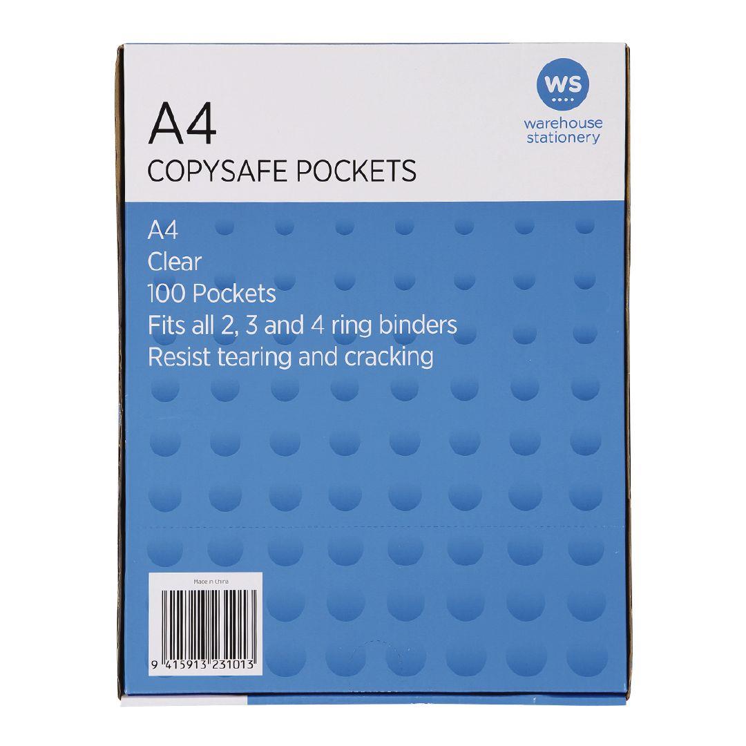 The WS Copysafe Pockets 100 Pack Clear A4 help you store important documents safely. These clear pockets are suitable for A4 size sheets and allow easy display of contents. They can fit all 2,3 and 4-ring binders and resist tearing and cracking.